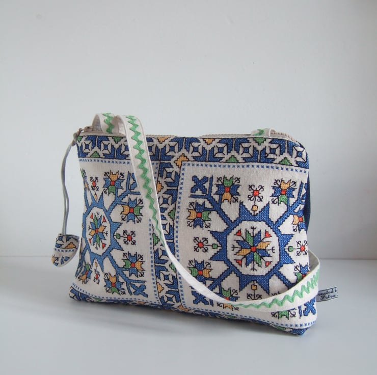 I have stitched a faded green vintage ric-rac braid along the two straps, which each measure 70 cm, making it useful as both a shoulder or handheld bag. I finished the bag off with my own embroidered name tag.