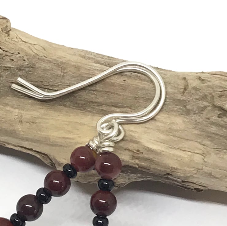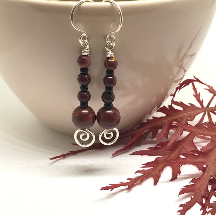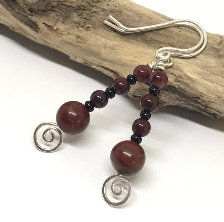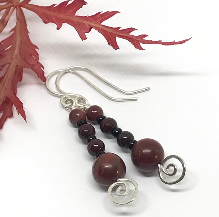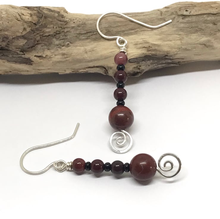 I have used sterling silver wire and shaped into a swirl design 8mm and 4mm red jasper beads are added with black seed beads in between and finished with a wrapped loop. This is added to handcrafted sterling silver earring hooks.