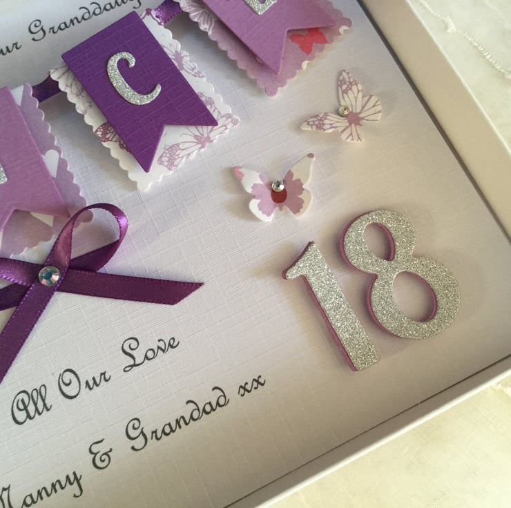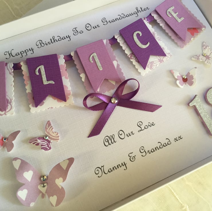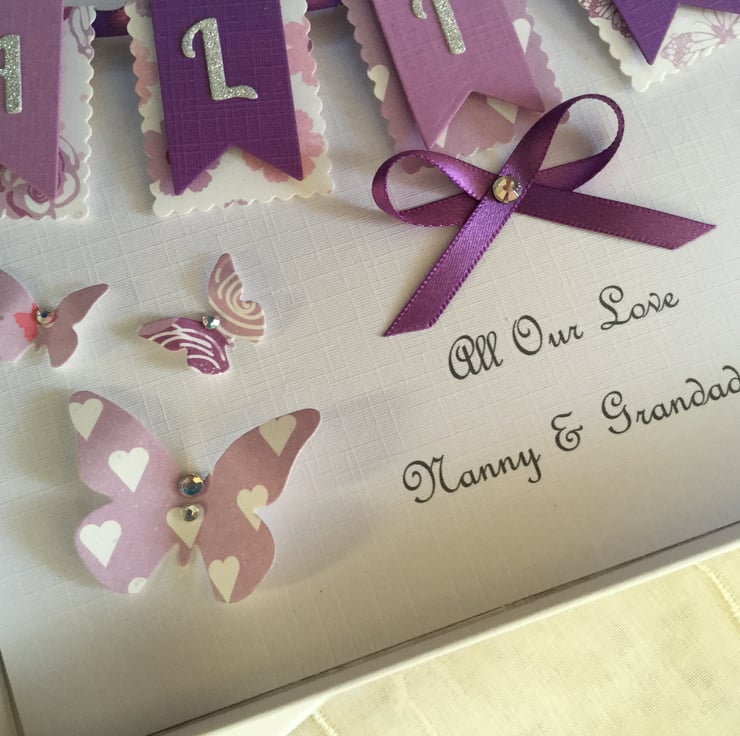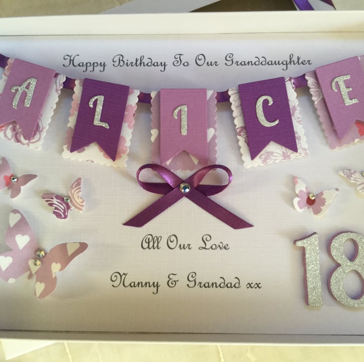 This handmade personalised card is A5 in size ( 210mm x 150mm) and is on 300gsm heavyweight linen cardstock. A name of up to seven letters can be made on the bunting. This card can be for any birthday or special occasion. Any text can be added above and below the bunting. Any age can be put on the card.