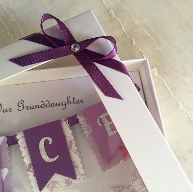 This card can be personalised with a name of up to seven letters and a greeting above and below the bunting. Any age can be added.