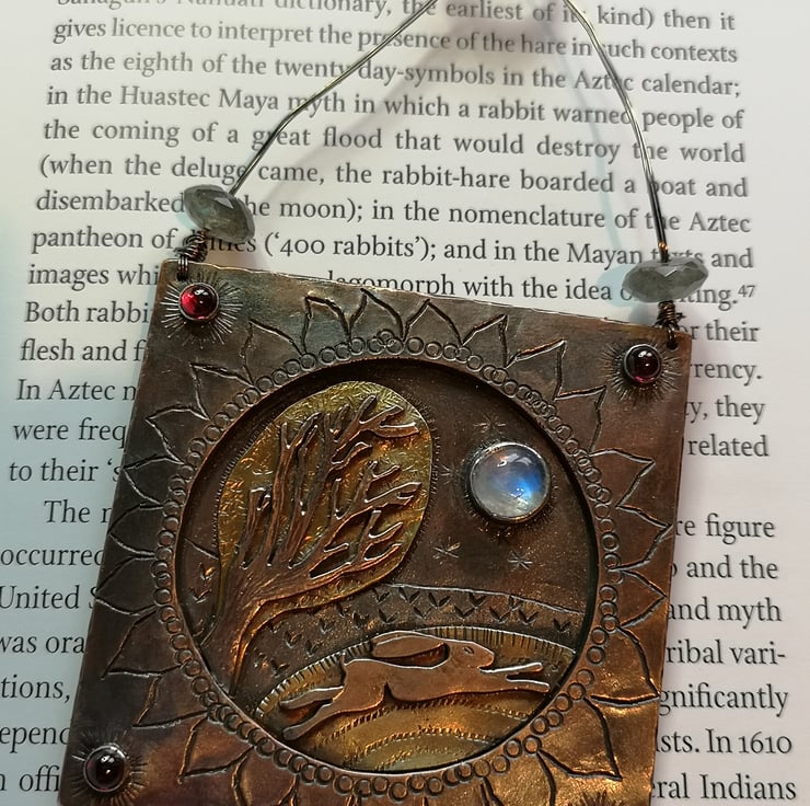 I make a lot of jewellery but I also like to create little boxes and pieces of art. Inspired by nature, this little picture features a hare and is set off beautifully with garnets and a moonstone.
