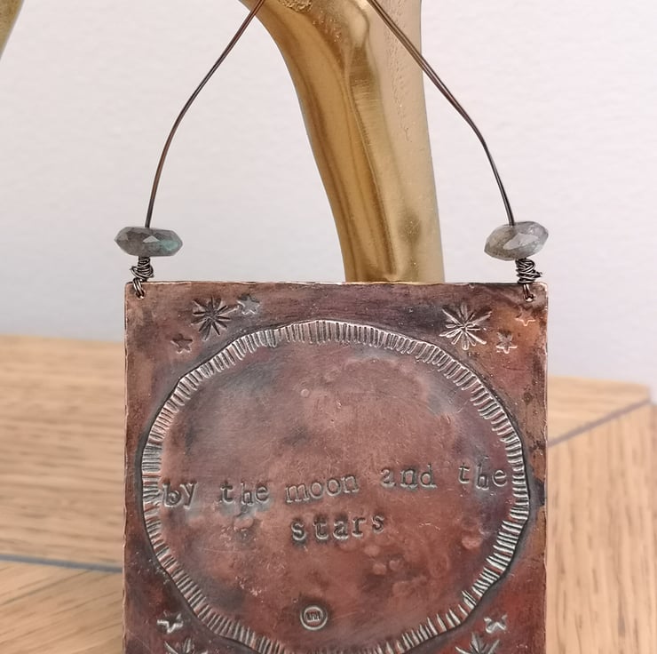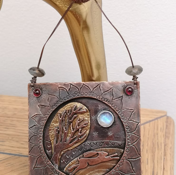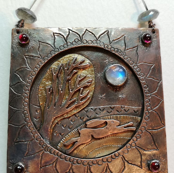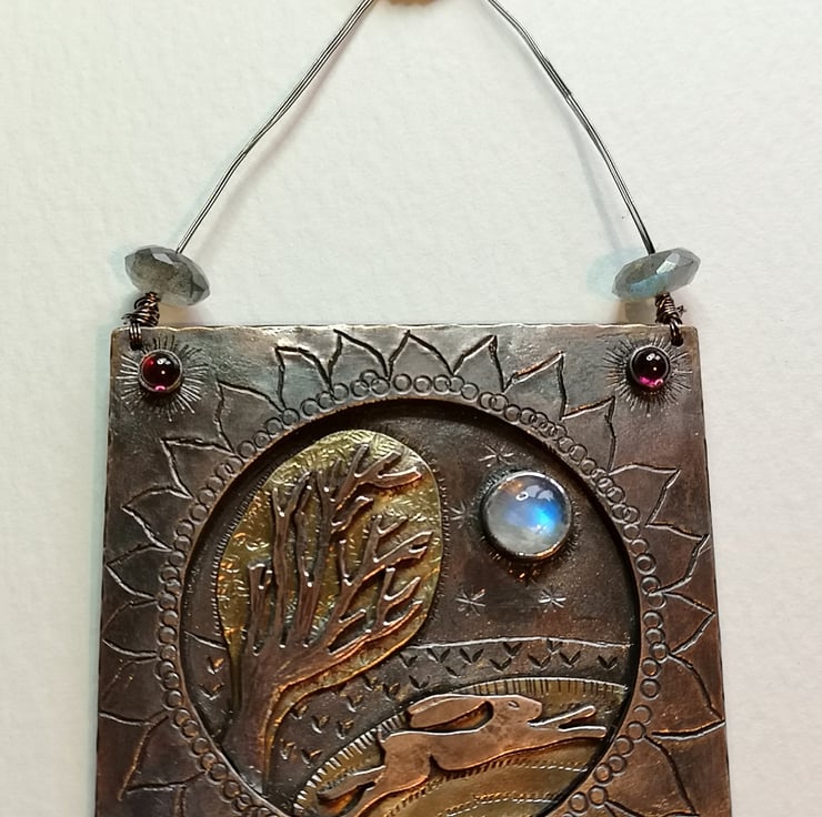 I have made this little hanging picture in copper and brass, using my piercing saw to cut out the metal, metal stamping, hand engraving and soldering. I have set 4 garnets and a moonstone cabachon. The hanging wire has two labradorite beads and the finished piece is oxidised.
