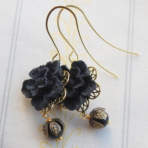 Beautiful black flower cabachon set on a vintage filigree with black pearl all which hange from French ear wires.