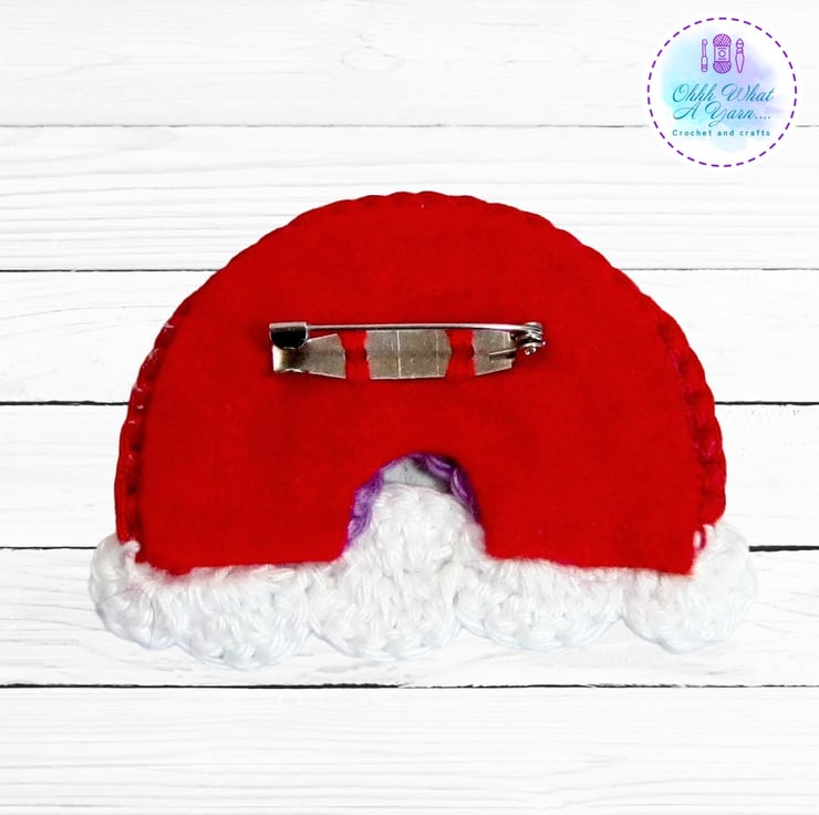 The rainbow has white fluffy clouds and is backed with red felt. It has a standard brooch back and is hand washable in cool water, dry flat and reshape while damp if necessary.