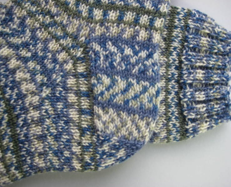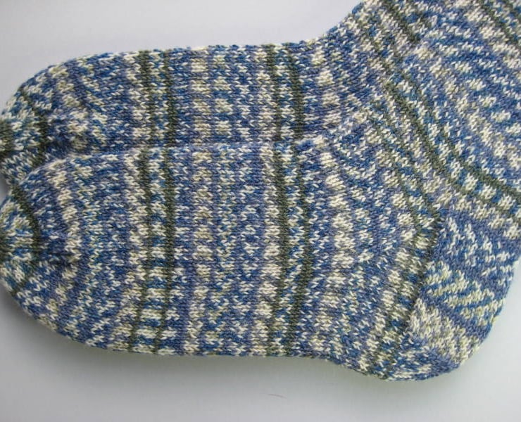 Hand knitted wool socks made from Regial 4 ply self patterning sock yarn, 75% wool 25% polyamide in shades of blue, green and cream. Made from very fine yarn, they are not thick and will fit most footwear. Warm and durable, these socks will keep your feet comfortable and bright throughout the year.