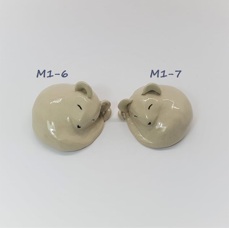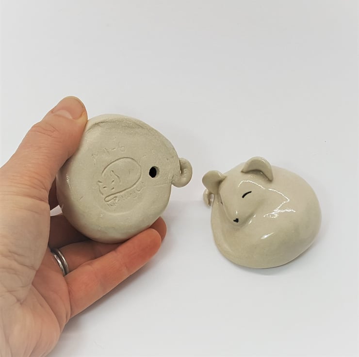 o Base: unglazed clay, stamped with ThePotteryCat logo and marked with the unique product identification number M1-6 and M1-7 (M for mouse, 1 refers to the size/style and 6 or 7 isitem number.) There also a small air hole to allow the air to escape during the firing process.