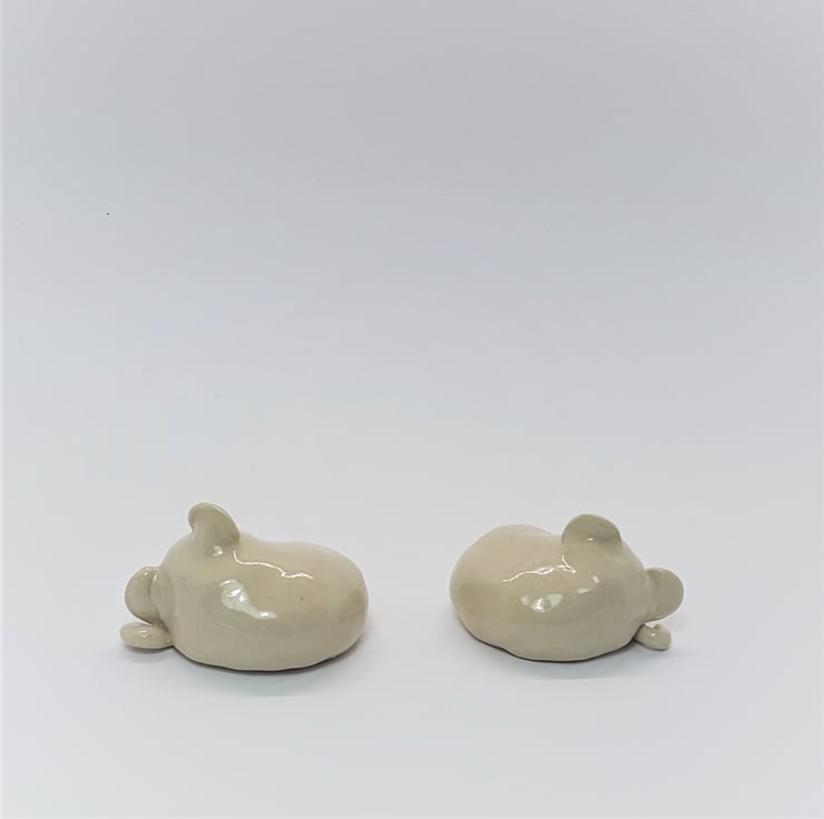 A pair of little mice, all curled up, having a peaceful sleep. They are small enough to sit in the palm of you hand, and would love to snooze on your book self or window sill, maybe under a nice plant, or out in the garden by a pond.