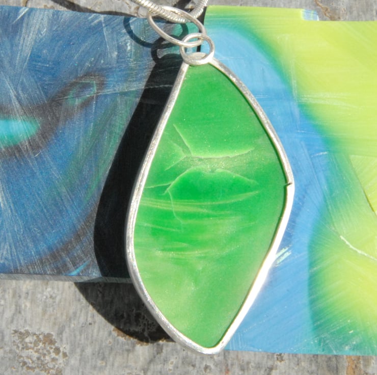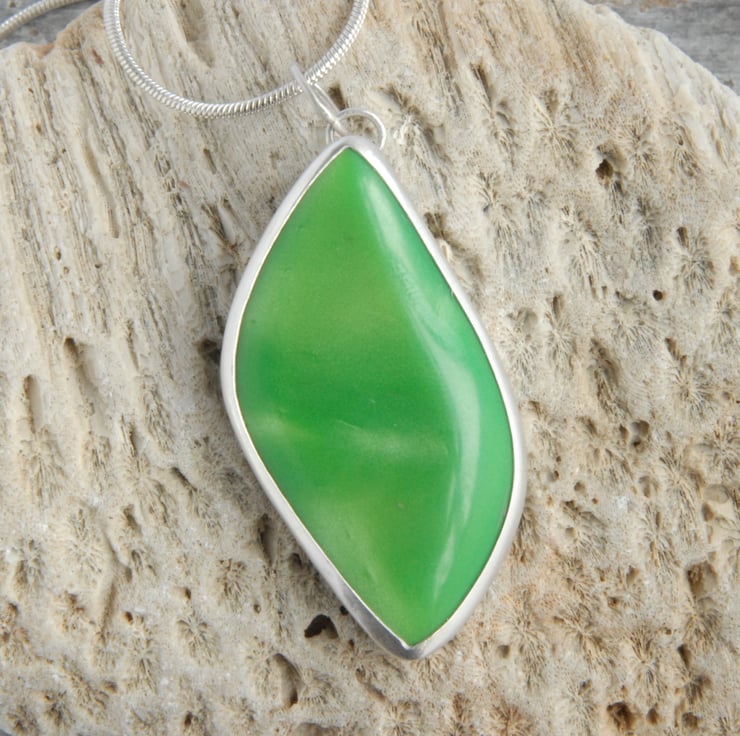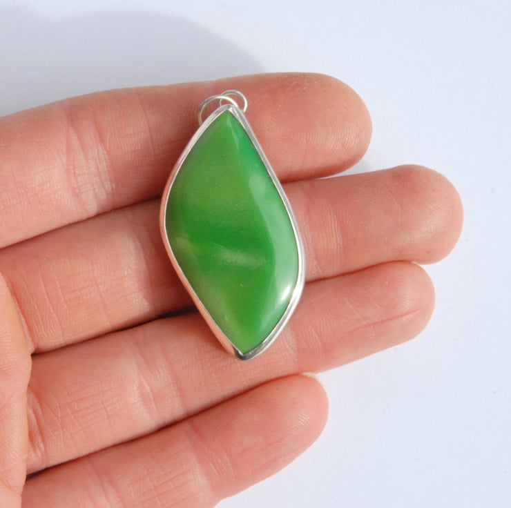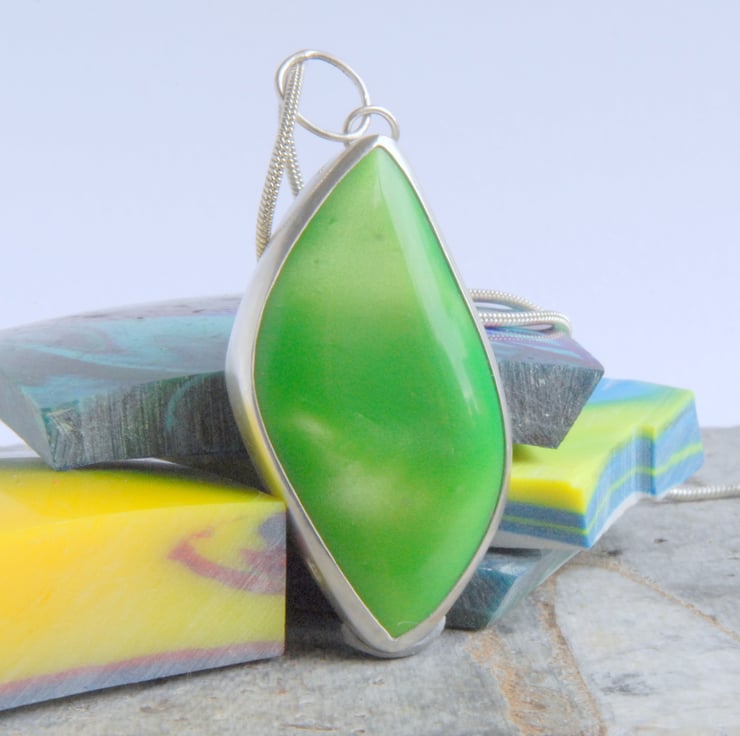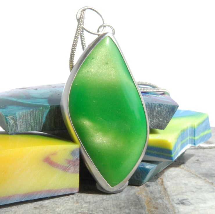 This chartreuse green pendant features a shimmery free form cabochon of bowlerite bezel set in sterling silver. The fresh green colour (it reminds me of granny smith apples, its that sort of shade of green) lends itself to the leaf like sinuous free form shape, the smooth curves make it a very tactile piece and the bowlerite is warm to the touch whilst the sparkles catch the light as it moves. Bowlerite is the name given to the hard plastic from the outsides of old 10 pin bowling balls so this is not only a nod to one of 2020's on trend colours but a great bit of eco friendly recycling as well. This bowling ball had a hard life, the back of the piece has a bruise from where it hit something very hard, this is smooth to the touch and has been stabilised to ensure that it won't crack or flake in the future. You can see some of the other pieces of rough bowling ball in the photos (not included in the sale) so if you love the idea of bowlerite as a gift for a bowling fan but would like a different colour or earrings or cufflinks then drop me a message and I'll have a look to see if I have a suitable piece of rough.