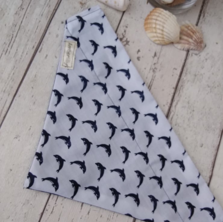 Reversible with a navy blue one side and and dolphins on the other.