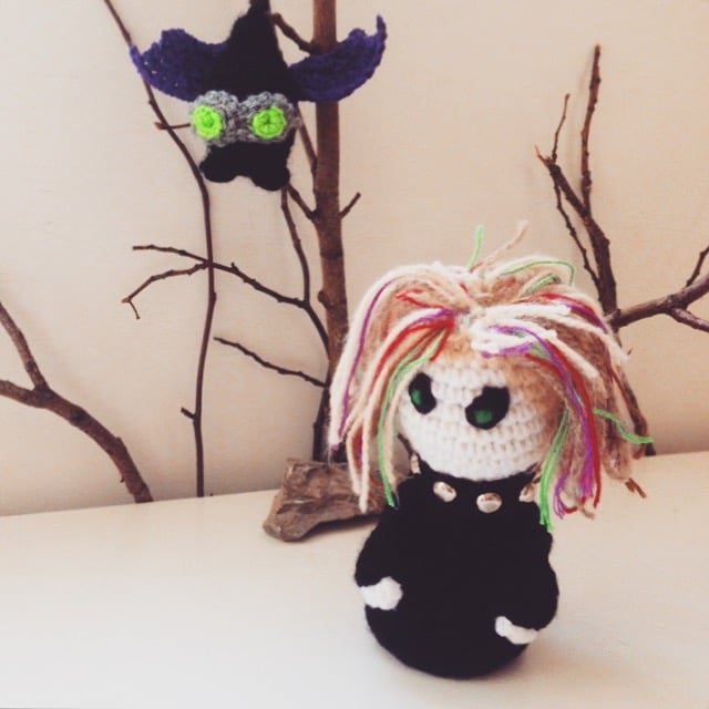 This little amigurumi goth, cyberpunk figure comes complete with Matrix style long black coat. He has multicoloured locks above an undercut. His outfit is completed with a studded collar.