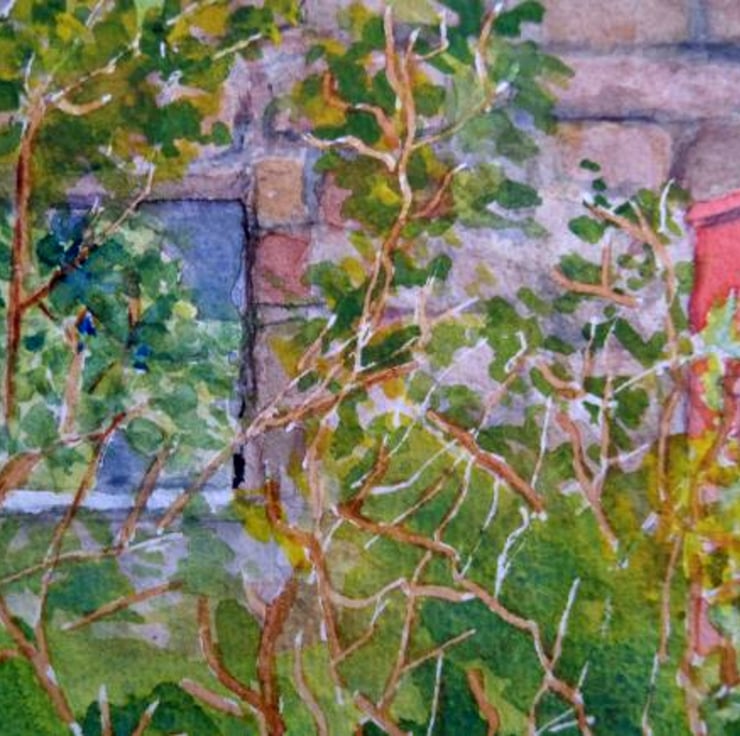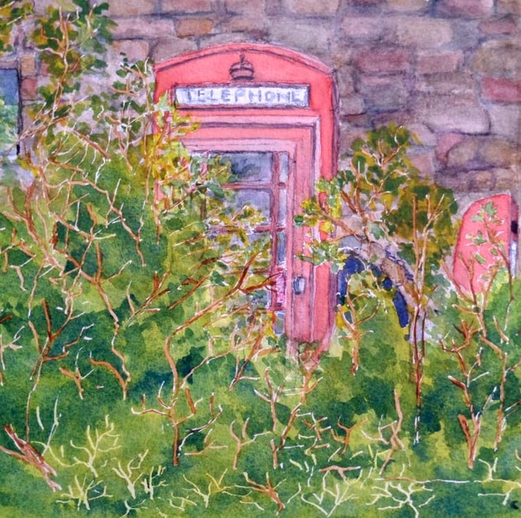 I have named this watercolour landscape painting "Communication Difficulties at Perranuthnoe" as it shows a classic K6 red telephone box and pillar box both obscured by overgrown foliage. Based on my own photograph. The red phone box is a design classic!