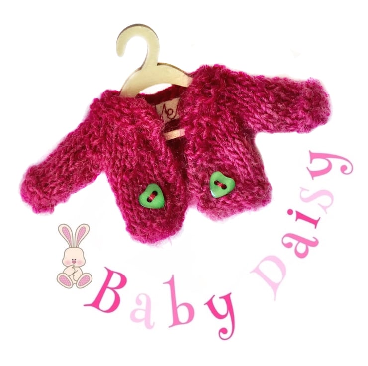 A cute little raspberry pink cardigan made especially to fit baby Daisy. The cardigan is decorated with two little heart buttons and comes on a little wooden hanger.
