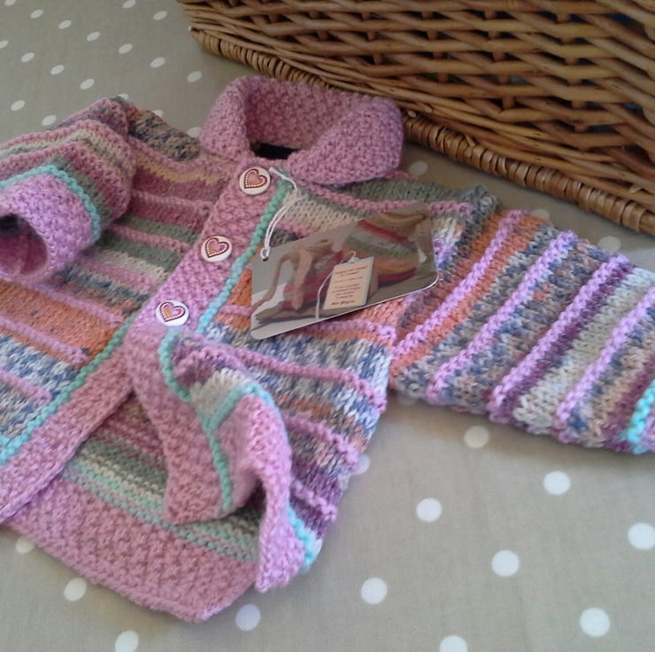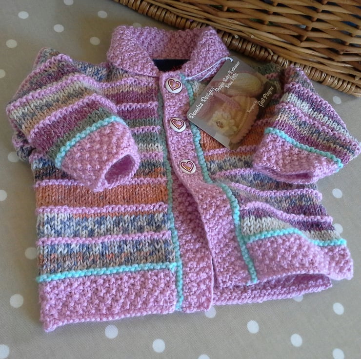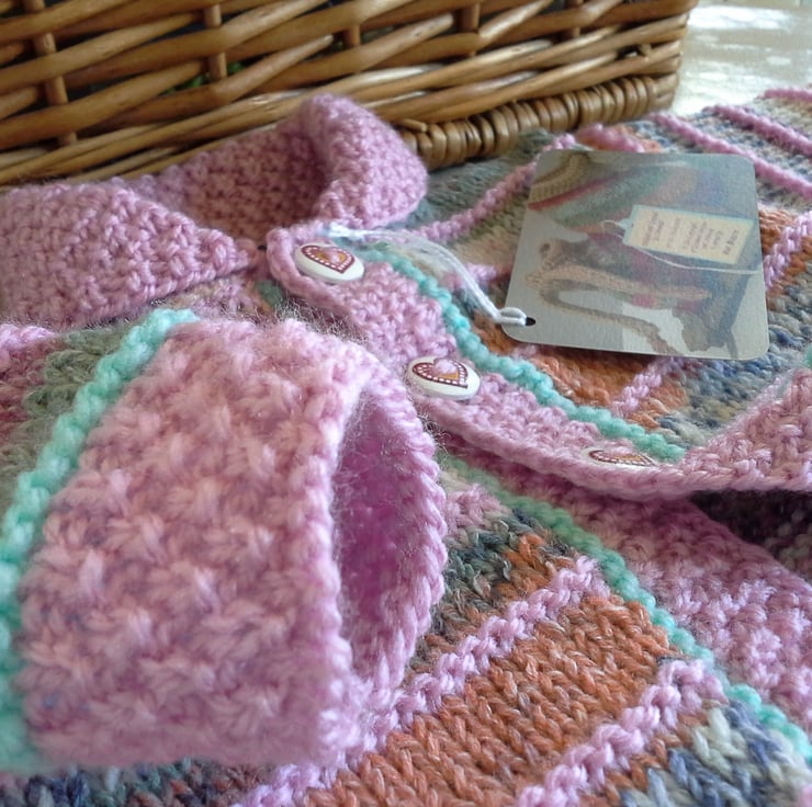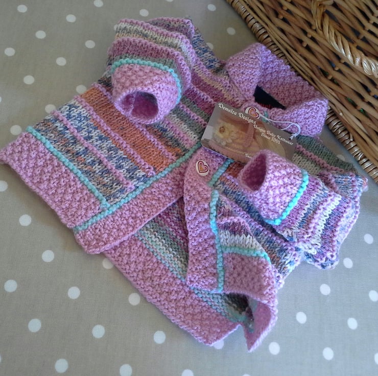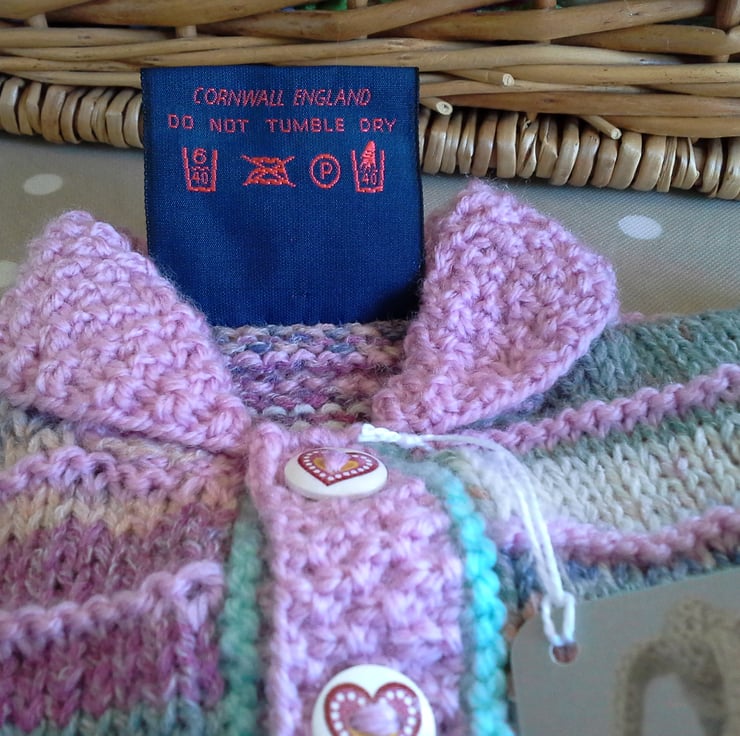 A unique baby girl's matinee jacket lovingly designed and hand crafted using quality British branded machine washable yarns. The buttons are made from genuine wood with a delicate design on them. The garment label is attached to the back neck edge with the care instructions woven within it and as proof of it's origins. The designer garment tag will be attached as shown, if removed the garment will be deemed as having being worn rendering it non returnable under Demelza terms and conditions.