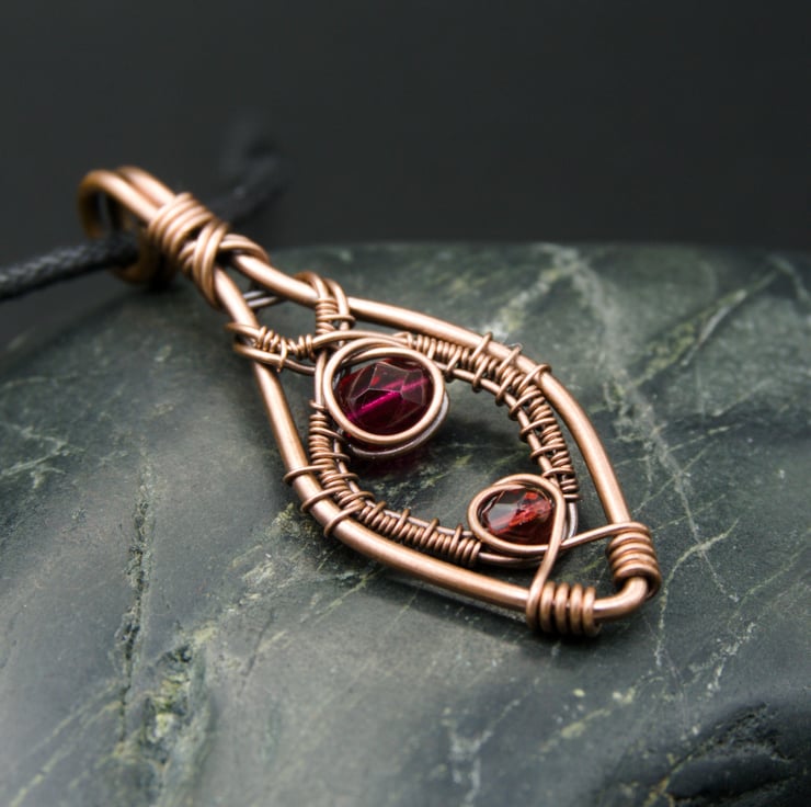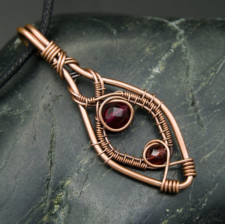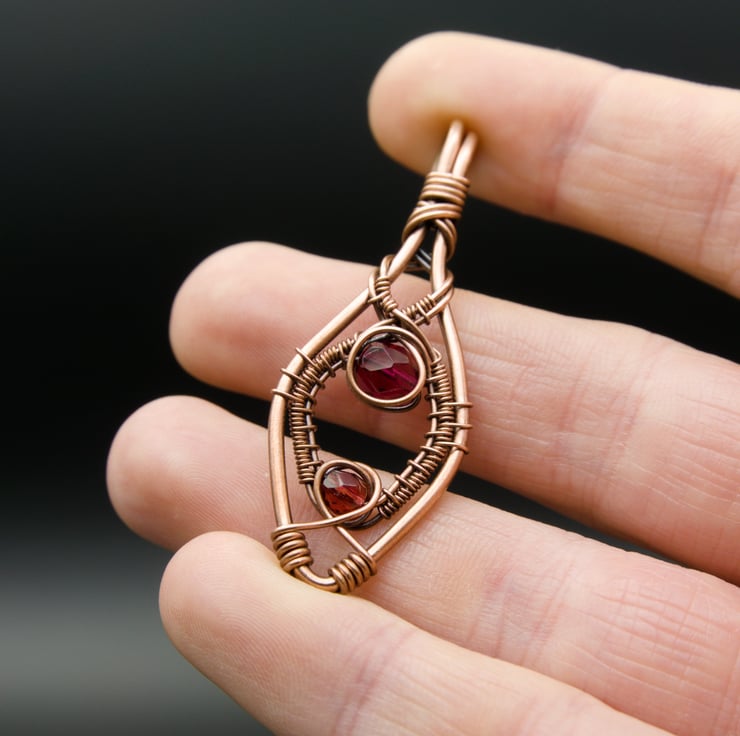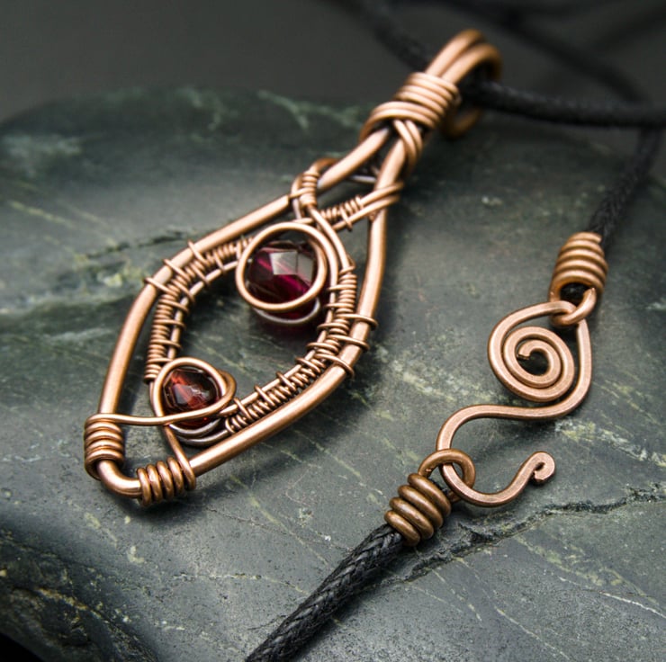 This distinctive pendant is made from copper wire. I've formed a pointed drop shape from thicker wire, & then have woven finer wires into the frame, adding faceted red glass beads where the wires cross over in the middle. At first glance both beads appear a dark red colour, but in the light the larger bead actually has a raspberry tint to it.