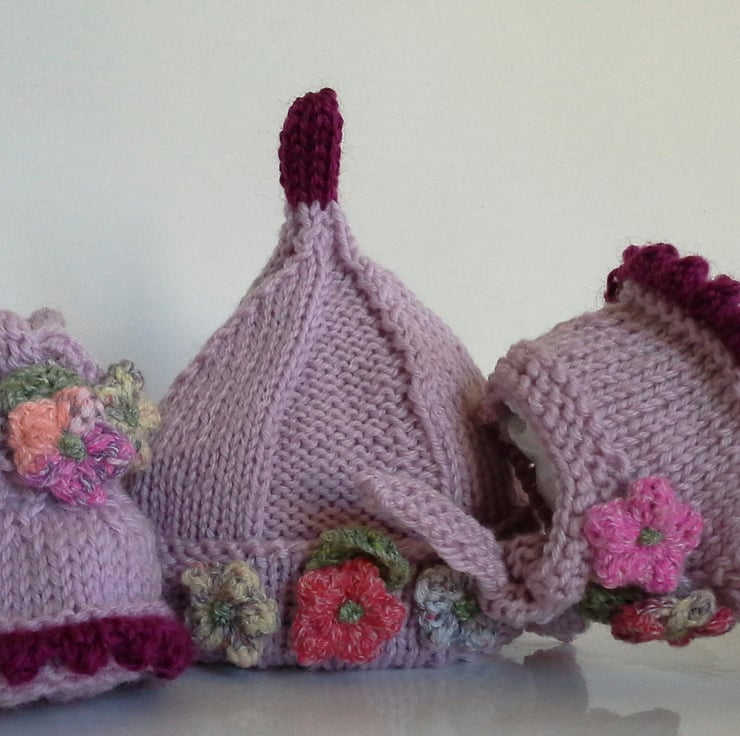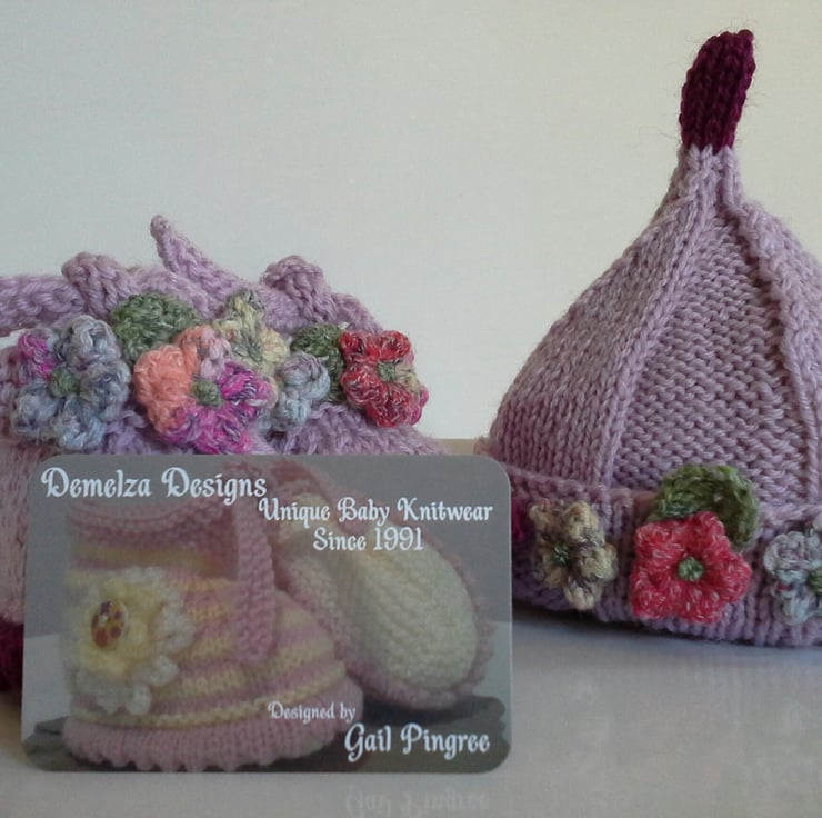 This is a very pretty practical eye catching gift set for a baby girl hand crafted using genuine 'Jaeger' branded merino wool. I have crouched the flowers using a hand dyed designer yarn containing cotton, wool and acrylic blended fibres and hand embroidered centre French knot details with one green leave which are pure merino 'Jaeger' 4ply yarn. The shoes are easy to put on and take off by using short ties. All yarns are machine washable at low temperatures on a delicate wash. The Jaeger ball band will be attached to one shoe with the Demelza Designs garment swing tag as proof of the sets origins if gifting.