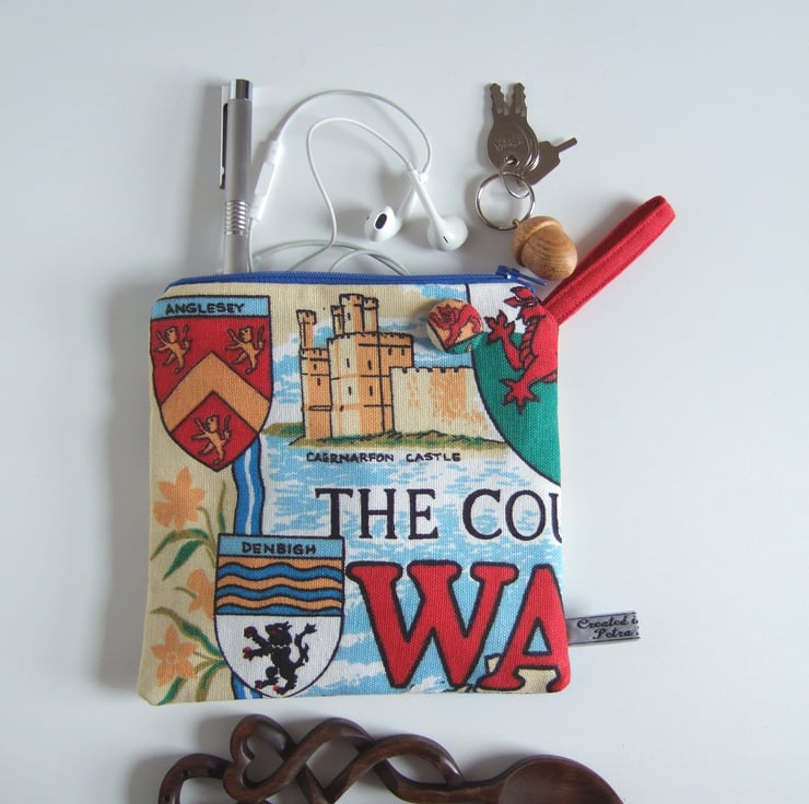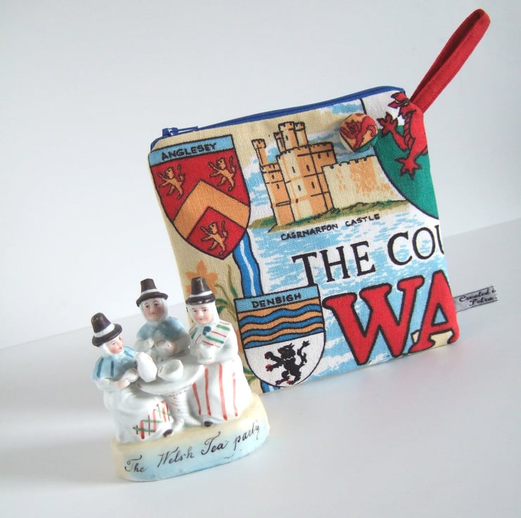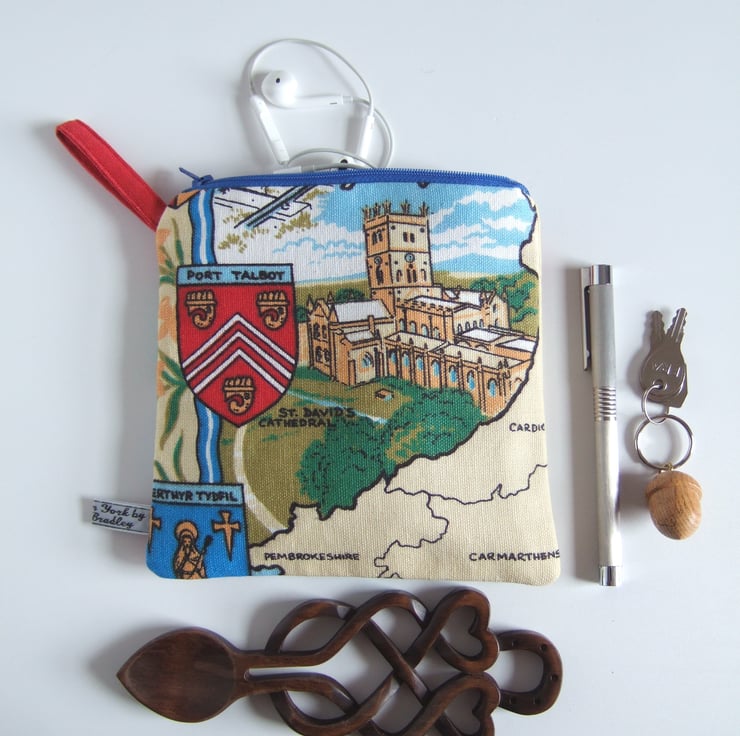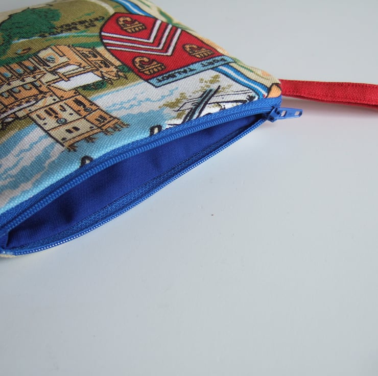 I have stitched this fabulous old Welsh tea towel into a practical little pouch or cosmetics bag. With a view of Caernarfon Castle on the front and St Davids Cathedral on the back, there is a hint of summer holidays, the sea, and Welsh coastal maps .I have managed to squeeze in the heraldic shields of Anglesey, Denbigh and Port Talbot, so they don’t feel left out!
