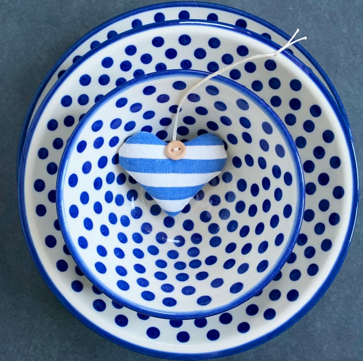 My signature lavender heart in classic blue and white stripes. Made especially to match my favourite striped pottery.