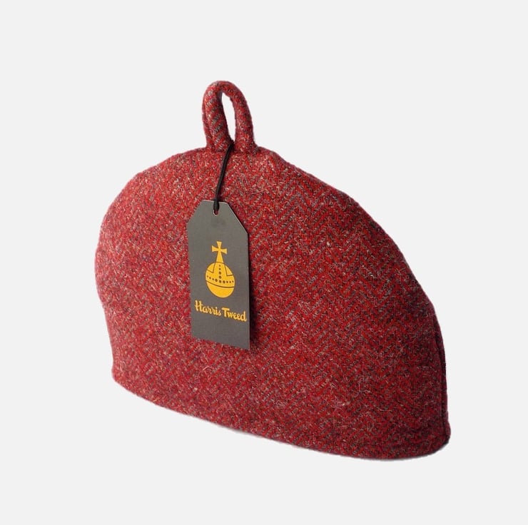 I have made this beautiful quality cosy from the world renowned Harris Tweed handwoven fabric in a gorgeous red and grey herringbone design. It is lined in white cotton fabric, and wadded with polyester to keep your tea warm. The Orb label, your guarantee of authentic Harris Tweed fabric is proudly displayed.