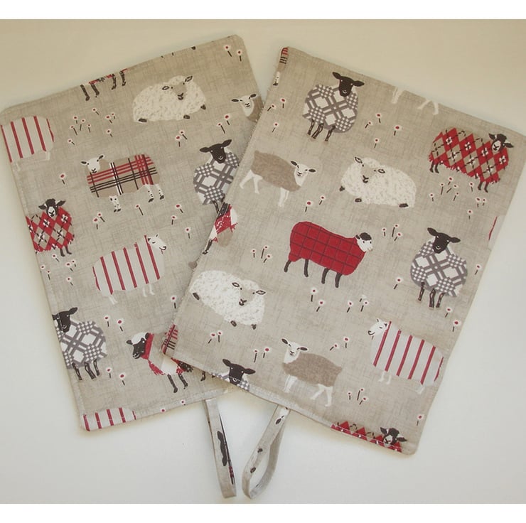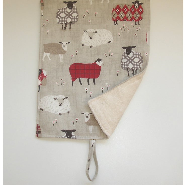 Featuring Sheep in patterns of tartan and stripes in Red Black and Beige Brown