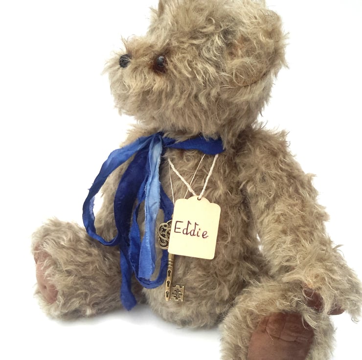 Eddie was handmade from 20mm Helmbold distressed mohair in mid grey on light tan.