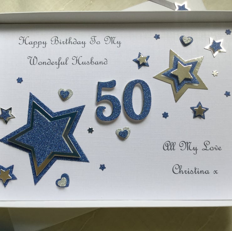 This handmade card is A5 in size (210mm x 150mm) on 300gsm heavyweight linen cardstock and can be for any special birthday. I can add any age in the centre and then personalise the greeting on the front of the card. I make each individual card to order and they are embellished with ribbons and gems. Inside the card there is a paper insert, ready for you to write your own message. I can, however, print a message inside the card for you. The card comes in a matching embellished gift box, as shown in the photos.