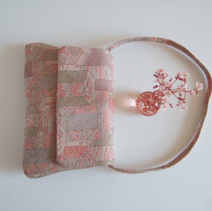 I have backed the fabric onto canvas to strengthen it, but it is still a very soft little bag. It has a fold over flap which closes with a gold magnetic clasp and I have used part of the lining of the original kimono for the inside.