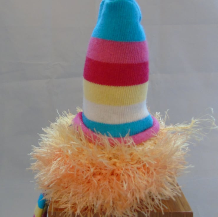 This charming, hand-stitched gnome is a truly one-of-a-kind creation, made with love from upcycled fabrics. The body and hat are crafted from repurposed T-shirts, while the nose is made from upcycled tights, giving each gnome a sustainable, eco-friendly touch.