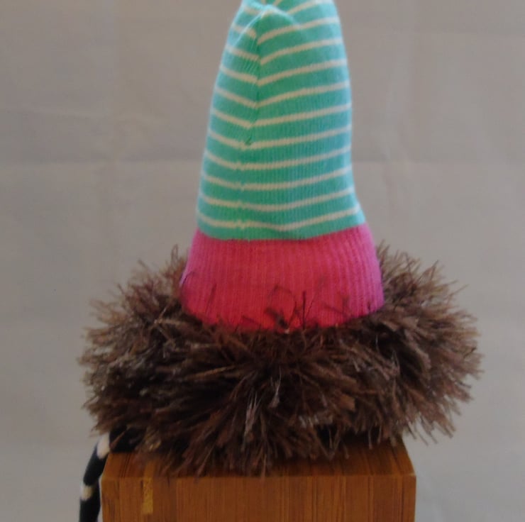 This charming, hand-stitched gnome is a truly one-of-a-kind creation, made with love from upcycled fabrics. The body and hat are crafted from repurposed T-shirts, while the nose is made from upcycled tights, giving each gnome a sustainable, eco-friendly touch.