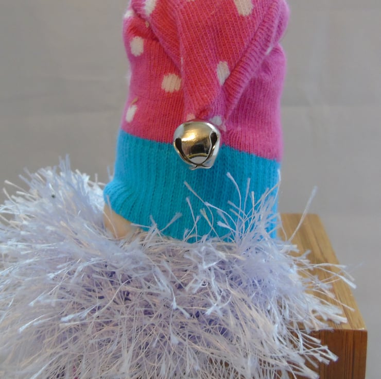 This charming, hand-stitched gnome is a truly one-of-a-kind creation, made with love from upcycled fabrics. The body and hat are crafted from repurposed T-shirts, while the nose is made from upcycled tights, giving each gnome a sustainable, eco-friendly touch.