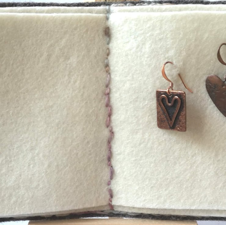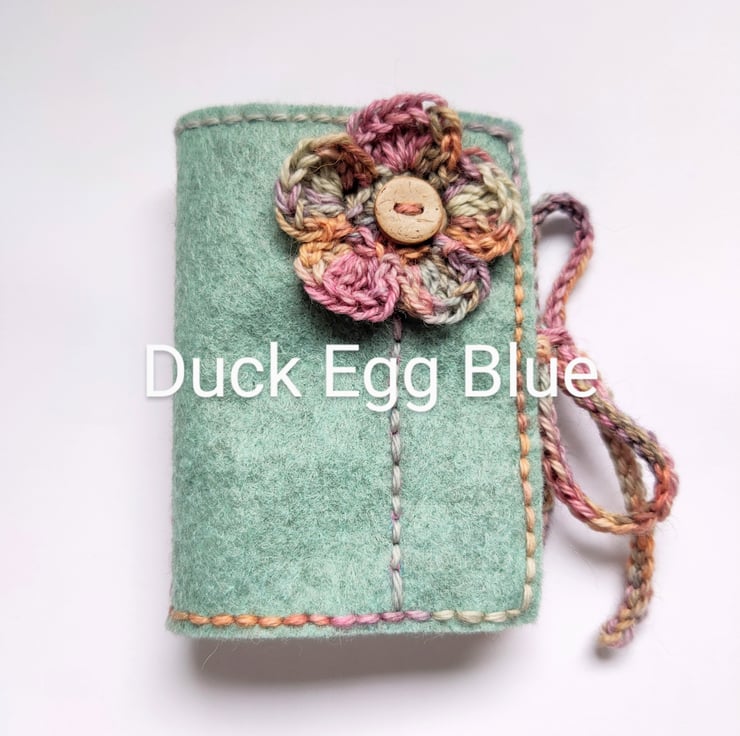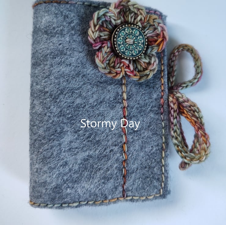 It's made of 100% wool felt and has four pages inside. The outside is decorated with a crocheted flower and has a crocheted tie fastener.