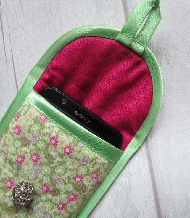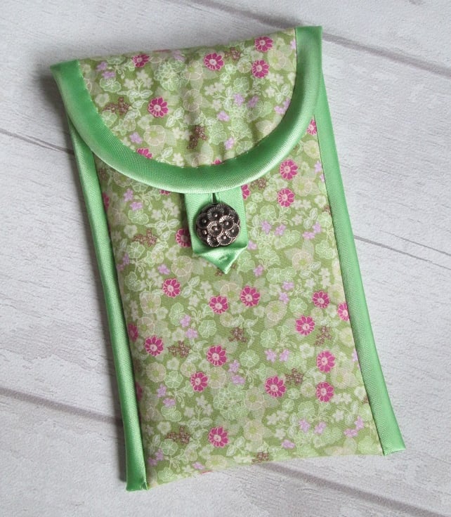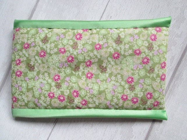 I've used a fresh and dainty floral print for this case and teamed it with a raspberry pink lining. Lightly wadded to protect the contents, it is finished with pale green bias binding and a loop and button fastening. It will take most pairs of glasses, phones up to 15 cm x 7.5 cm x 1 cm, and could also ne used for pens/pencils, pills, tampons etc.