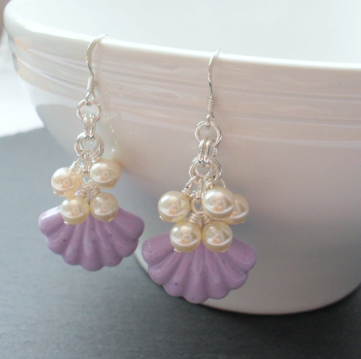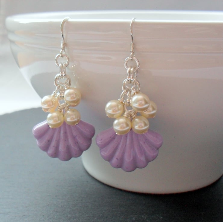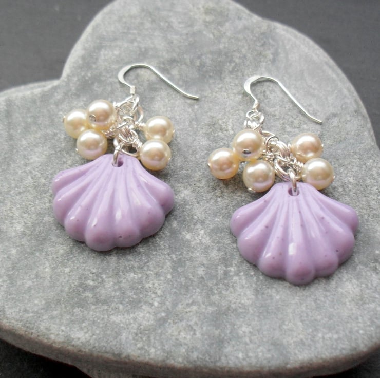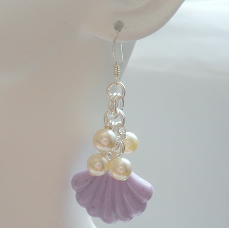 These earrings are made with Lilac resin handmade shells which have little flecks of purple and swarovski® crystal cream pearls attached with silver plated jump rings and then have then been attached to sterling silver ear wires