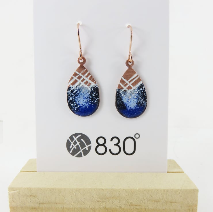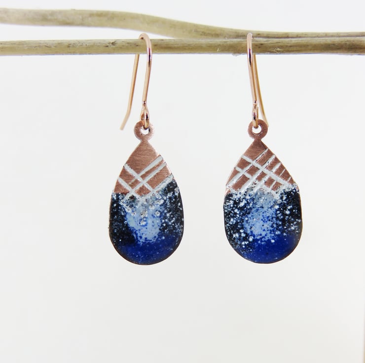 25mm x 12mm teardrop copper dangle earrings decorated with line texture and the bottoms covered in blue and black enamel. Hung on rose gold plated earring hooks for pierced ears. Fired in the kiln at 830 degrees.
