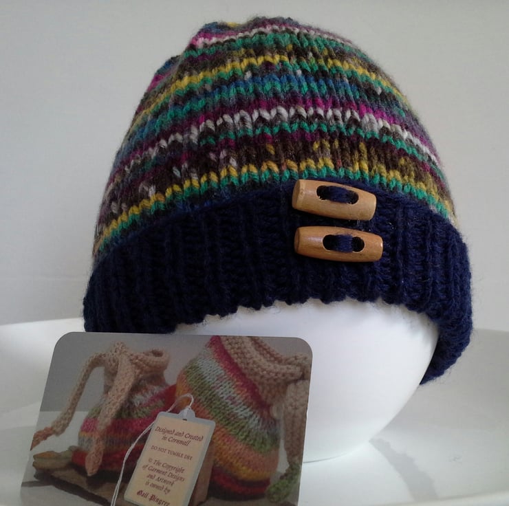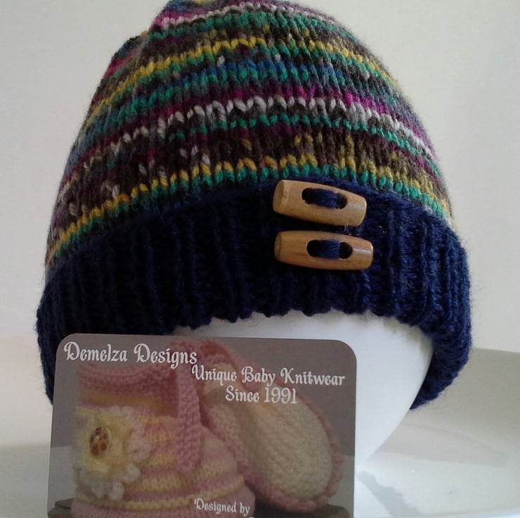 A sweet practical baby boys hat designed and hand knitted using my own design knitting pattern using branded British machine washable yarns. The hat will be ideal for chilly and cold days to keep those delicate ears and head cosy and warm whilst out and about. All knitted products come with the Demelza Designs garment tag attached as proof of their origins if gifting.