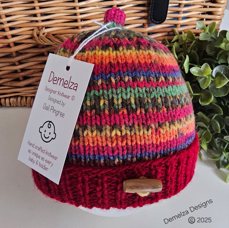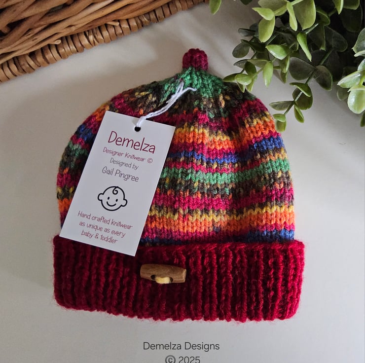 This practical baby unisex hand knitted hat has been lovingly designed for created in Cornwall using branded machine washable British acrylic yarns. It has one wooden toggle style buttons for added detail at the centre front of the welt. On the inside back seam the luxury soft damask Demelza Designs garment label has been attached with the care instructions woven within it. On the front is the branded garment swing tag providing a professional finish if gifting.