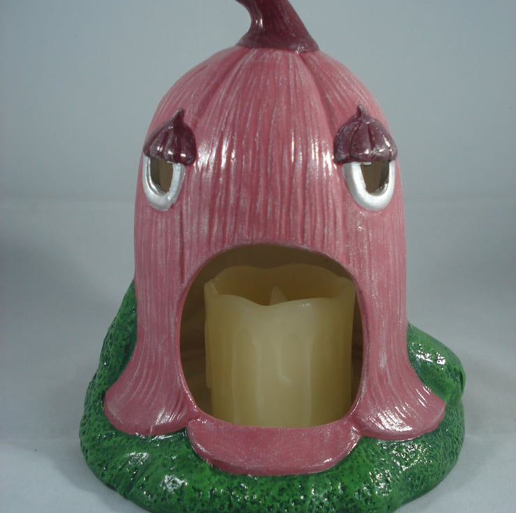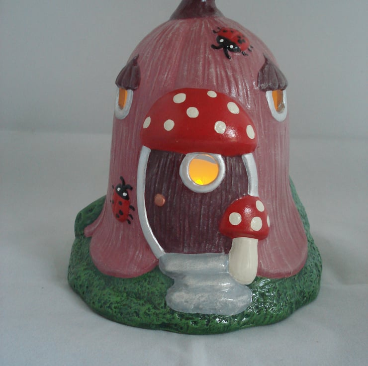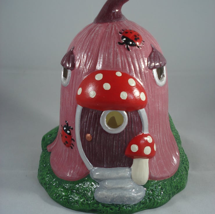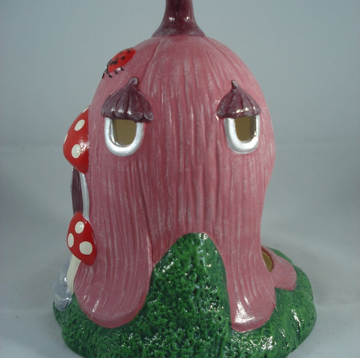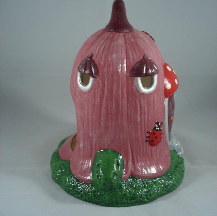 I have for sale a ceramic candle/tealight holder, which was hand painted by myself. It is in the shape of a pink bell shaped flower, which looks like a little woodland fairy house or cottage. There are small holes in the windows and the door for the candlelight to shine through, with a larger hole at the back for the tealight. PLEASE NOTE: the battery operated candle is not included in the sale, this is for display purposes only. This would make a lovely addition to anyone's home, garden, patio or perhaps given as a gift.