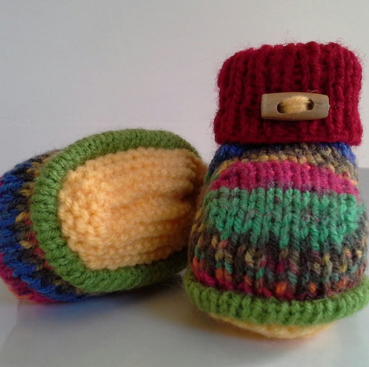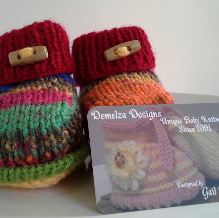 A sweet pair of baby booties ideal for everyday wear to keep those delicate toes and feet cosy and warm. These have genuine wooden buttons for added design detail. They will make a perfect token newborn or baby shower gift if the sex is not known for any baby boy or girl. One bootie has the Demelza garment swing tag attached as shown as proof of their origins if gifting.