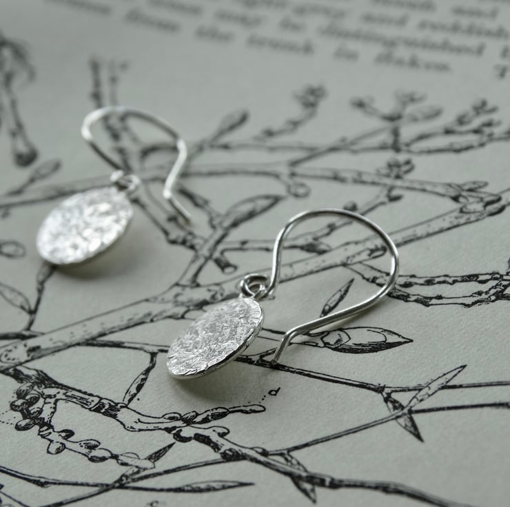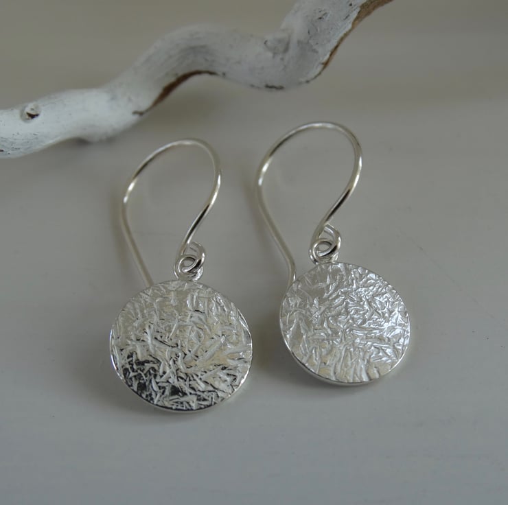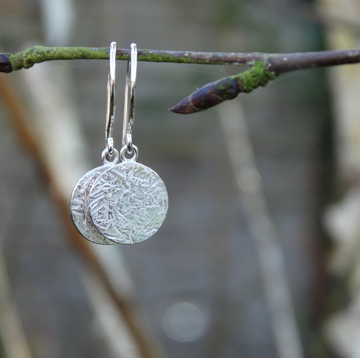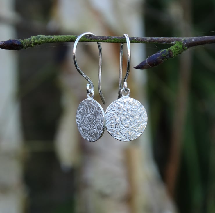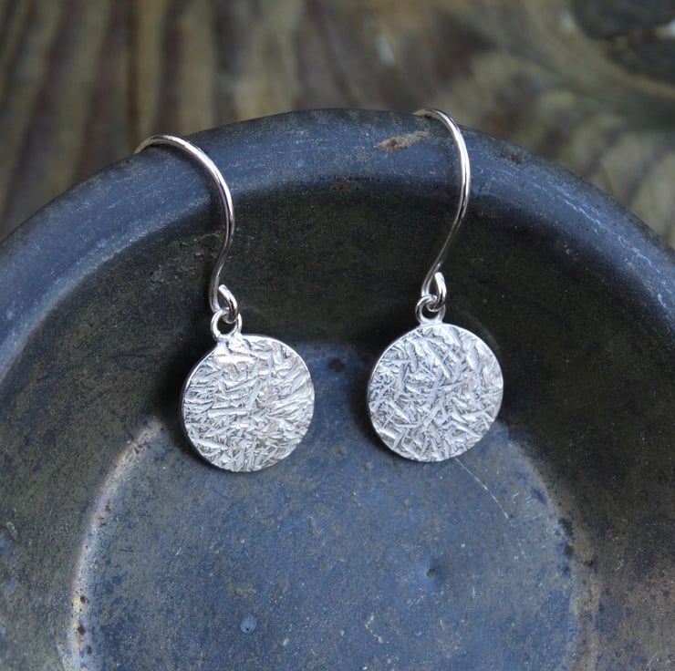 These earrings have been made by cutting circle shapes from recycled sterling silver (Eco Silver) sheet by hand using a jeweller's saw. The silver has been textured all over - the texture is applied by hand, giving each disc its own unique pattern. The discs hang on handmade earwires, formed from recycled sterling silver (Eco Silver) wire.