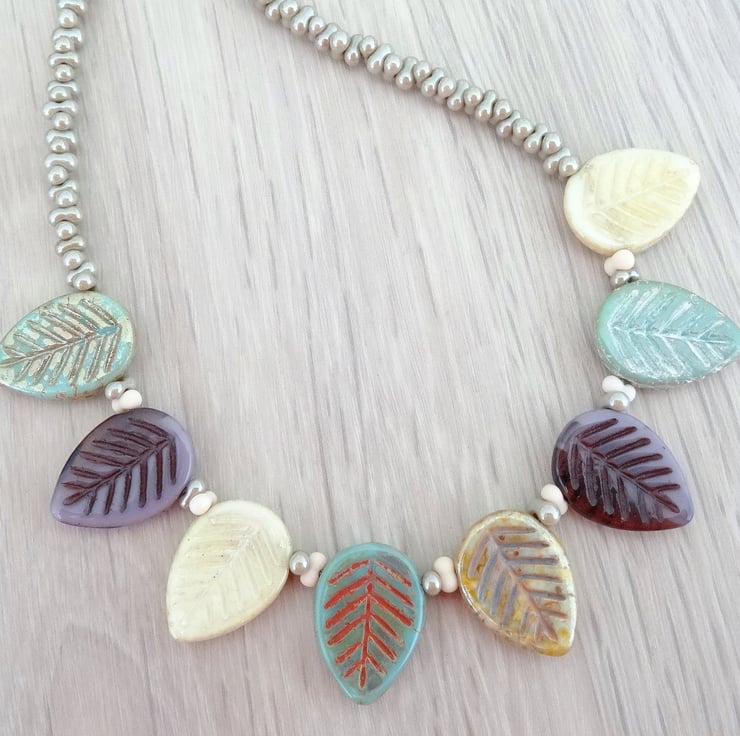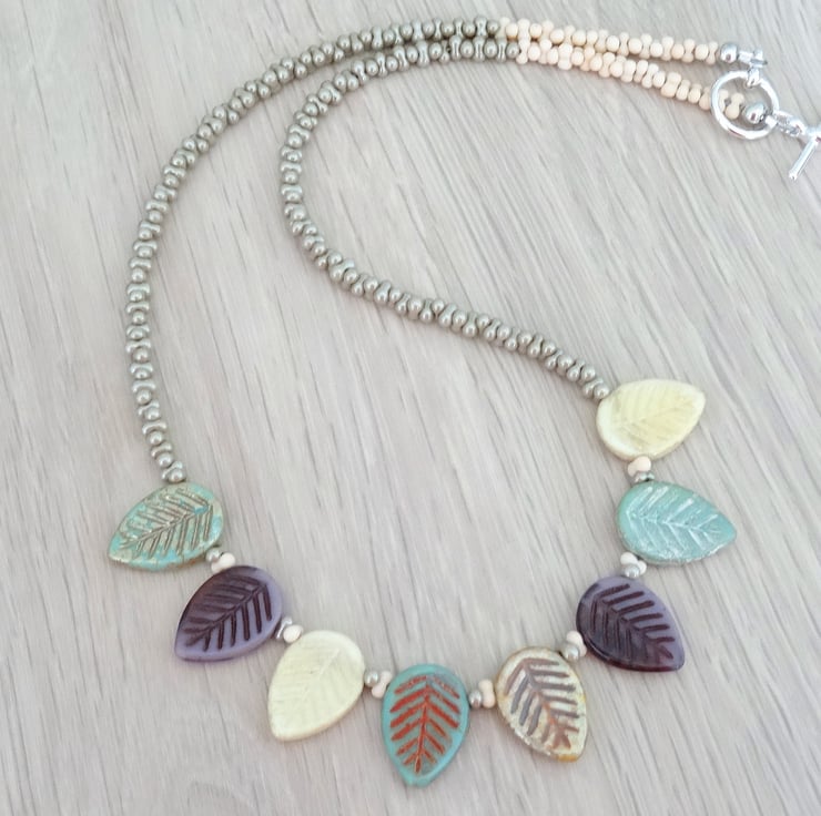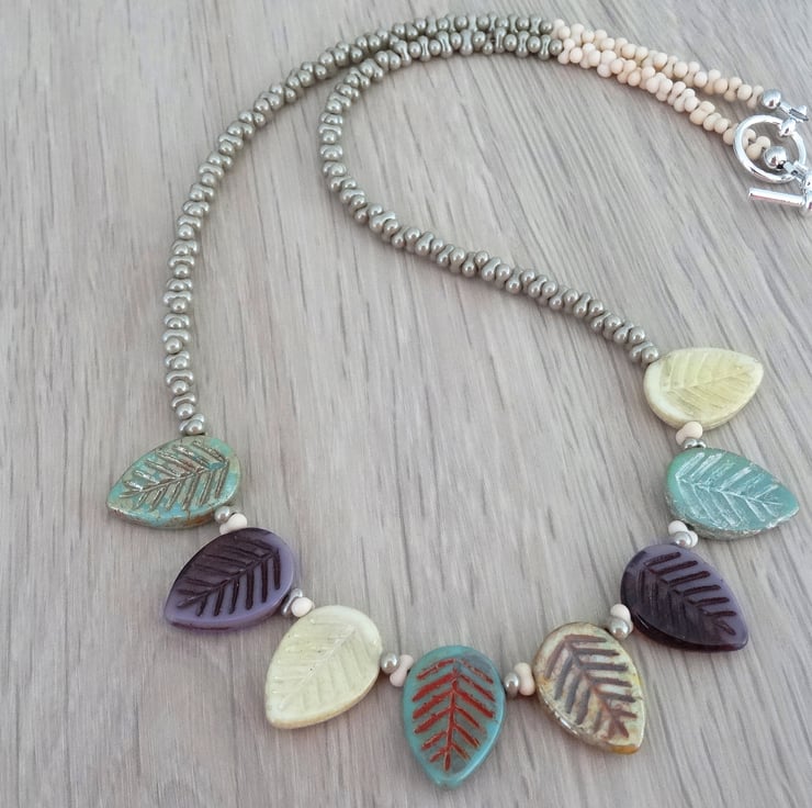 This is a lovely necklace made entirely with high quality czech glass beads. I have used 15mm leaf beads in shades of sage, green, mauve, cream and wheat. For the upper body of the necklace I have used 2 x4mm sage green lustred peanut beads and matte cream peanut beads. This necklace is unique and just perfect for summer. The necklace measures 18 inches (46cm) and closes with a silver plated toggle clasp.