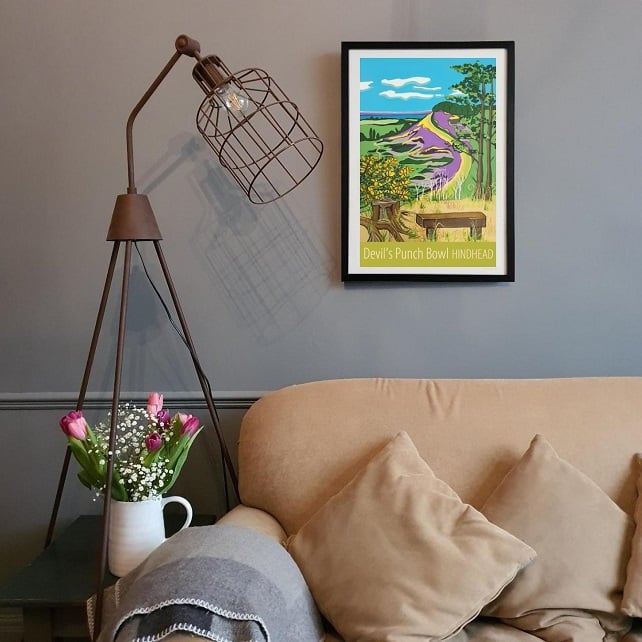 A contemporary travel poster style print of the National Trust's fabulous Devil's Punch Bowl, Hindhead, Surrey, where nature has reclaimed the old A3 route, from my own original acrylic painting.