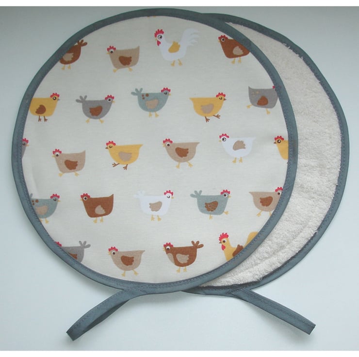 This mat has three layers - Facing cotton fabric, a layer of padding and a layer of towelling - Making it also suitable for mopping up and pot-grabbing!