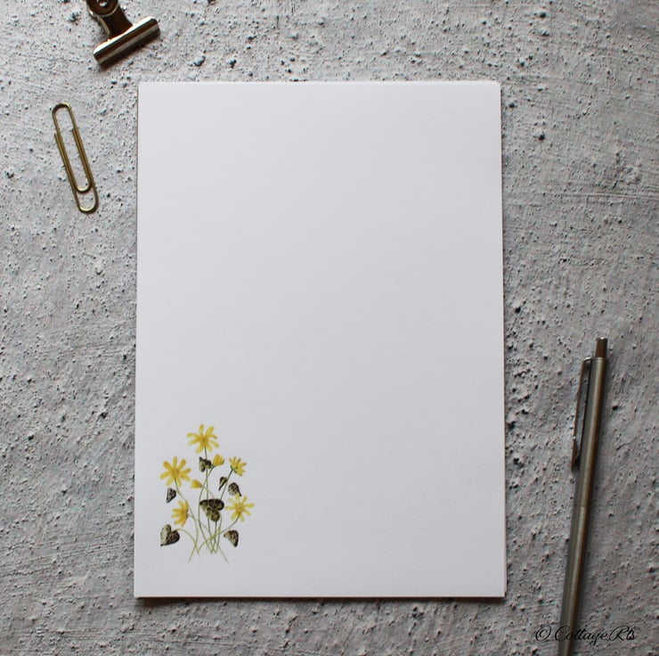 - 10 sheets of A5 100gsm laid letter writing paper with the Lesser Celandine design in the bottom left of the paper.