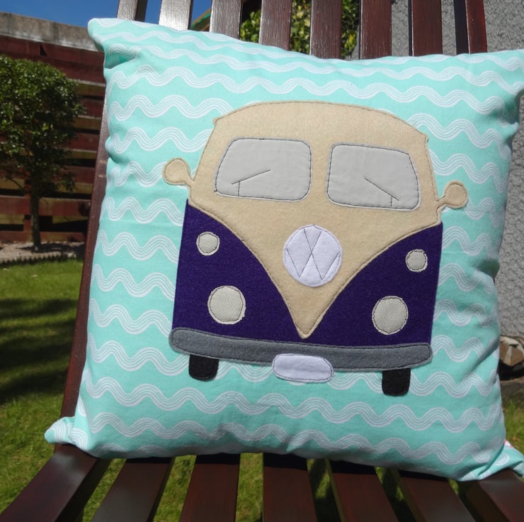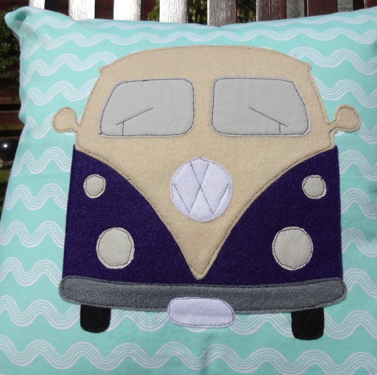 Handcrafted cushion cover with the campervan design being in applique.