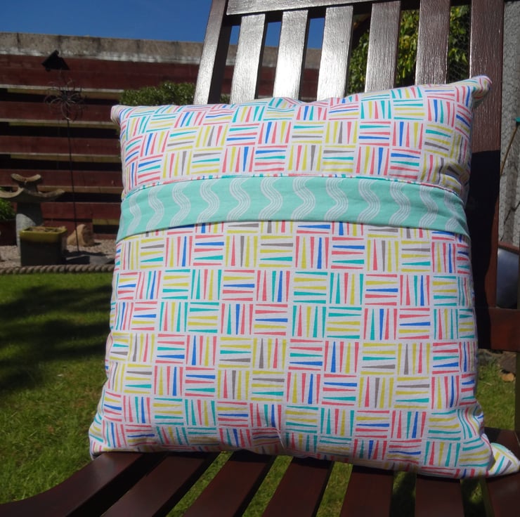 The zipper is concealed along the back of the cover under the contrasting fabric strip.