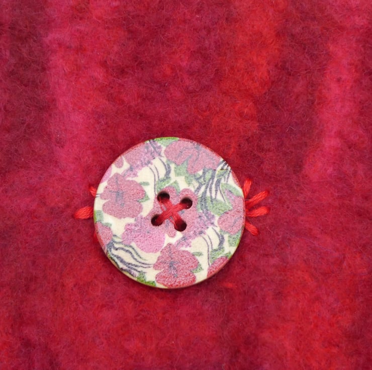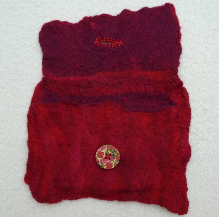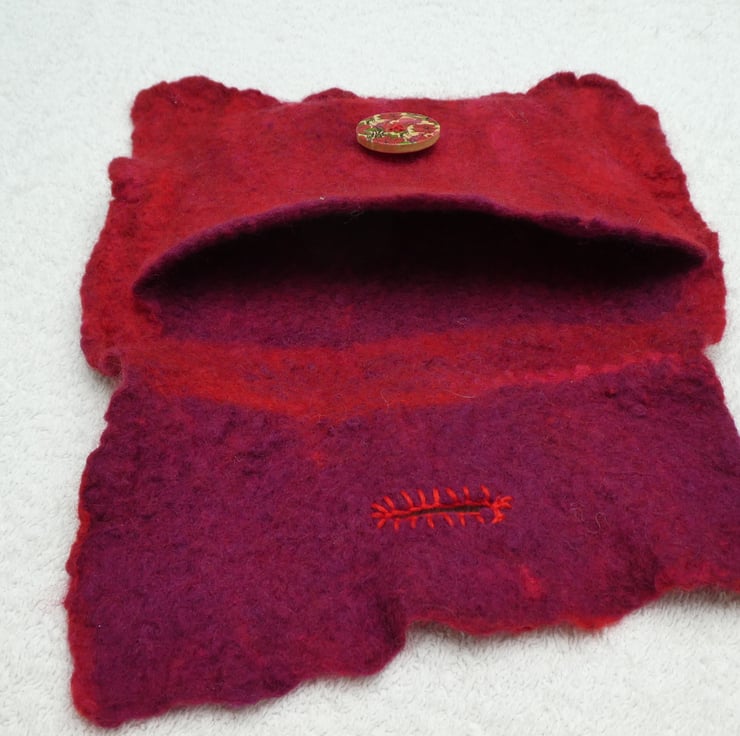 This hand felted purse has been created from 100% pure merino fibres in red for the main body colour. The inside of the purse is purple. The felt was created as one complete piece over a former, with hand embroidery button hole stitch to decorate the button hole. I have sewn on a hand painted wooden button to complete the purse.