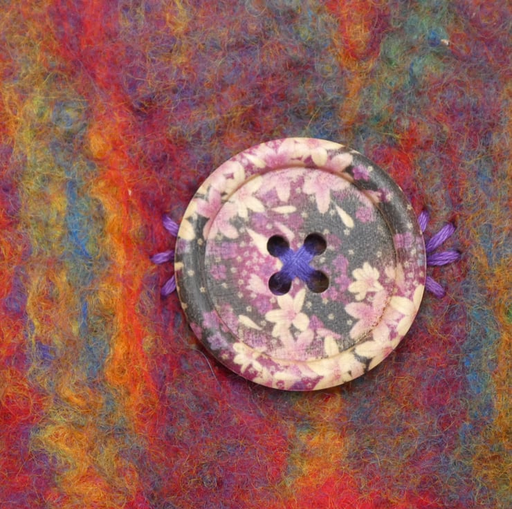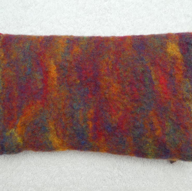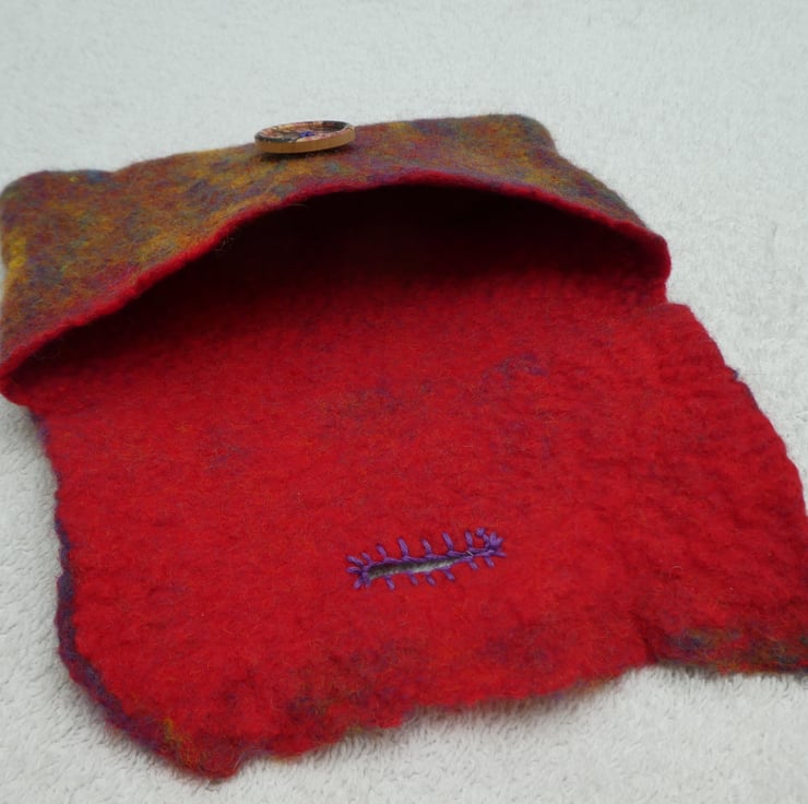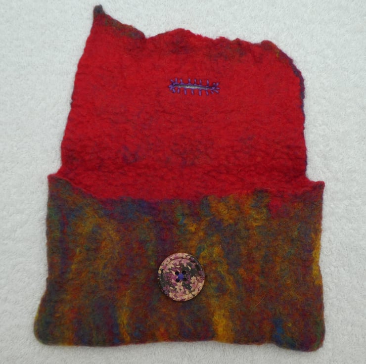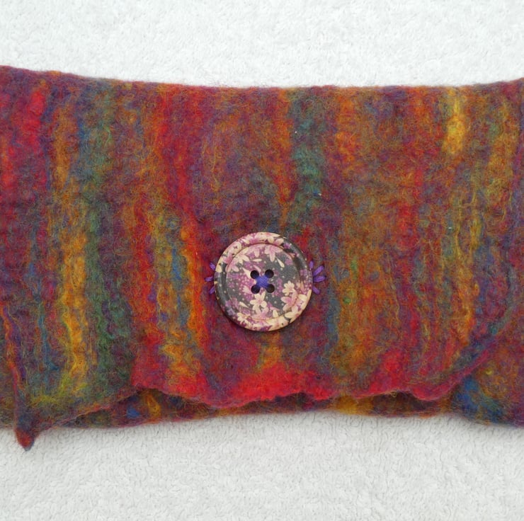 This hand felted purse has been created from 100% pure merino fibres in rainbow colours for the main body colour. The inside of the purse is red. The felt was created as one complete piece over a former, with hand embroidery button hole stitch to decorate the button hole. I have sewn on a hand painted wooden button to complete the purse.