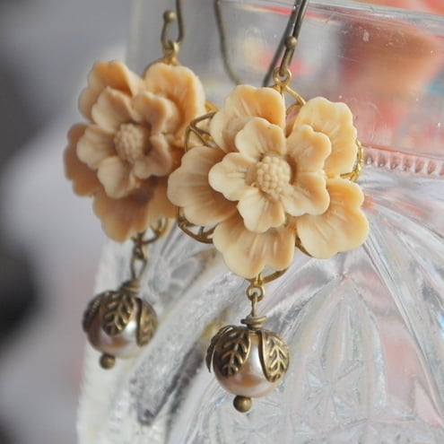 Gorgeous vanilla flower cab earrings set on to brass filigree