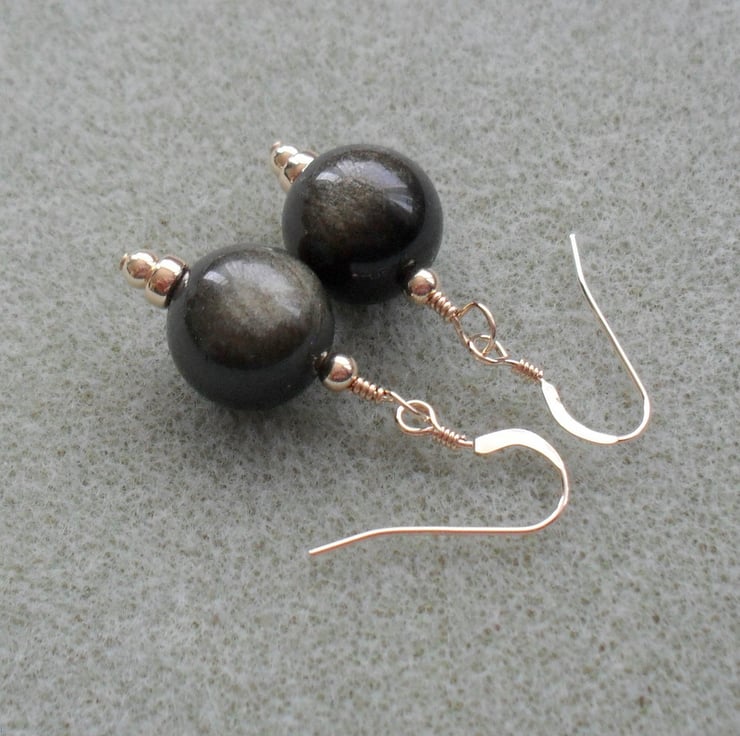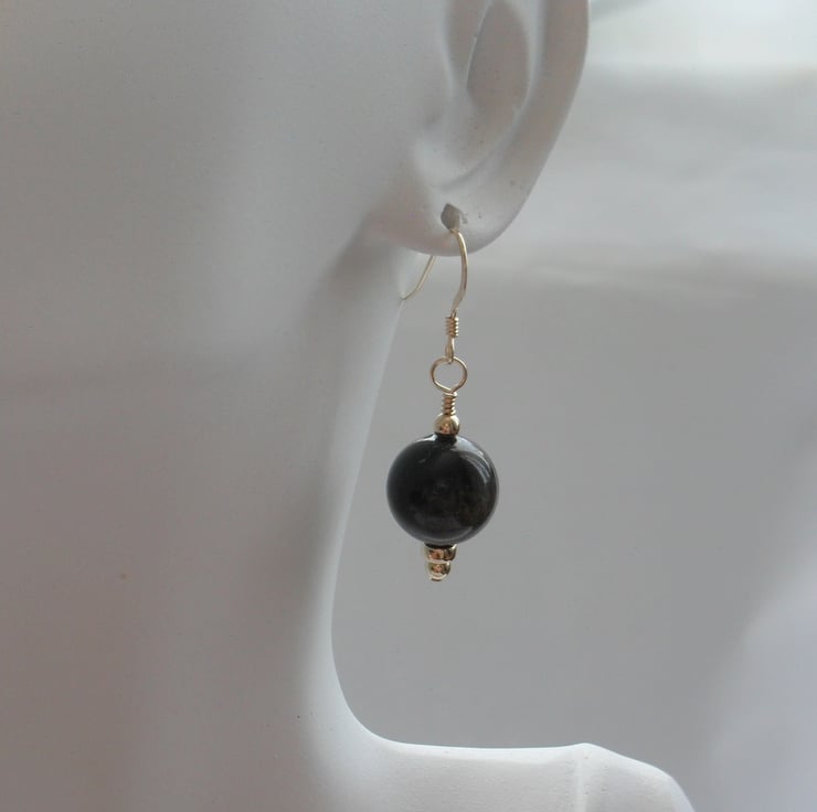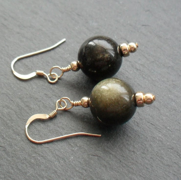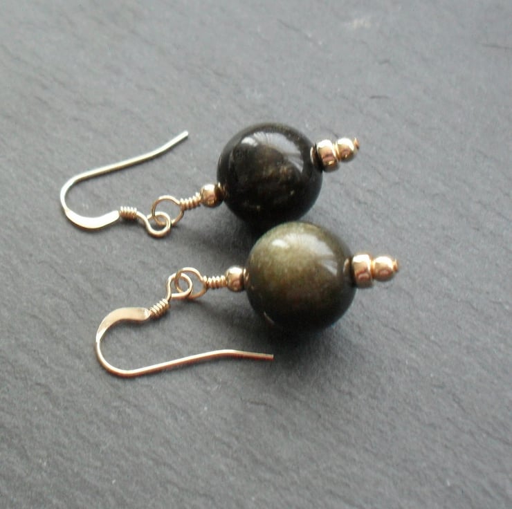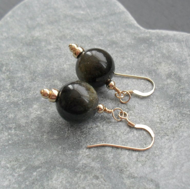 Golden obsidian semi precious gemstones have a lovely golden shimmer as the stone moves. The gemstones are attached to gold filled ear wires .