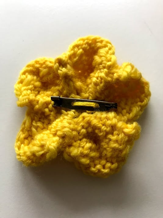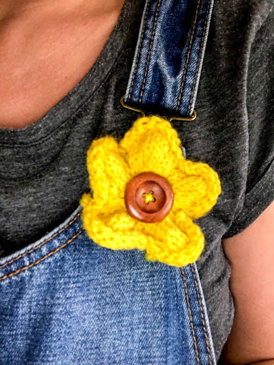 Knitted in beautifully soft cashmerino aran yarn, this yellow flower is hand sewn with a brown wooden button and a brooch bar pin safely secured at the back.