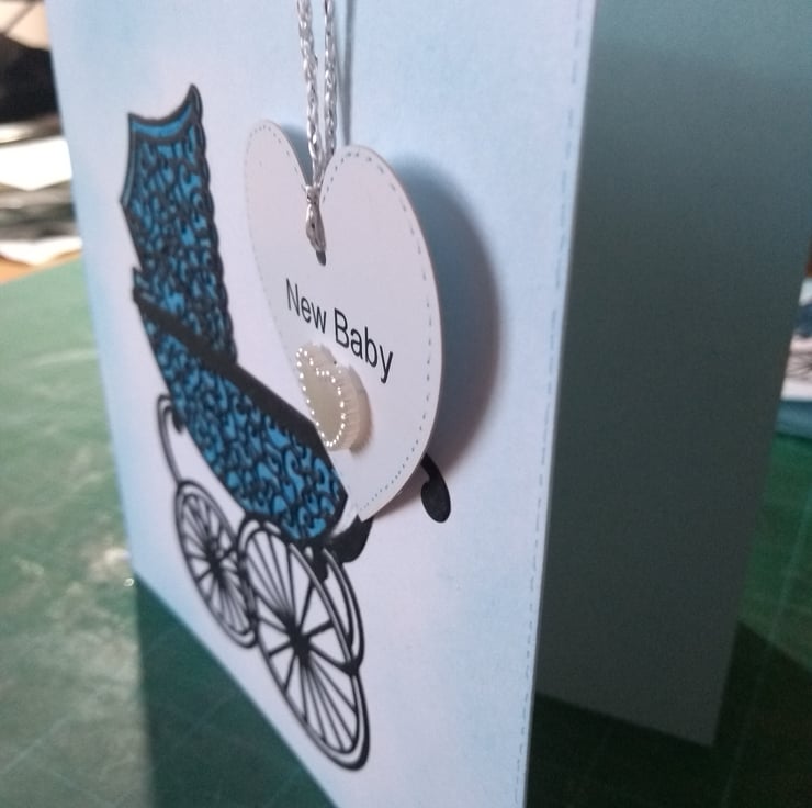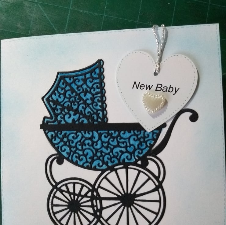A completely handmade and uniquely designed card. Considering of a beautiful pram die cut from black card. Hand coloured and clear embossed to resemble stained glass. Mounted onto quality pristine white card which has been shaded areas n baby blue. Finished off with a heart tag with new baby and s pretty pearl plastic heart.